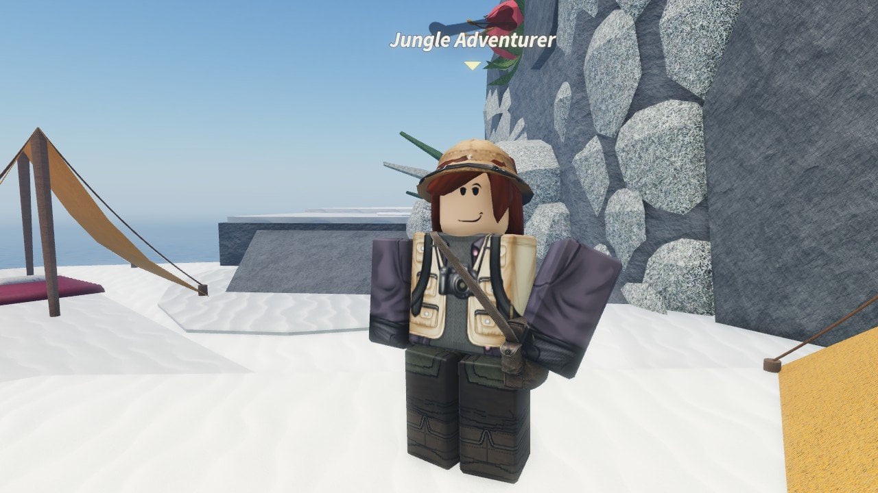 Feature image for our Fisch Vinefang Rod guide. It shows the Jungle Adventurer NPC in Jungle's Echo.